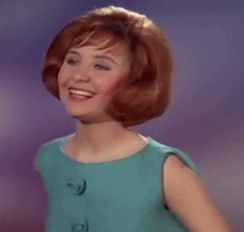 Lulu, a woman with red hair, makes a funny, expressive face while wearing a blue dress.