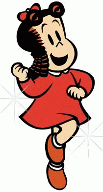 Lulu Luz, a cartoon girl in a red dress, joyfully dancing.