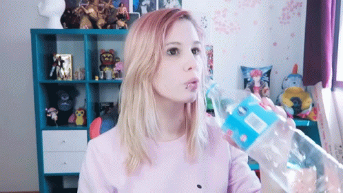 Luna Dangelis drinks water from a large plastic bottle, showing her blonde hair with pink highlights.