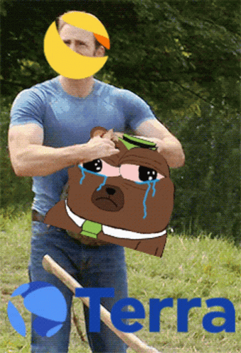 A meme depicting the Luna Terra crypto crash, with a crying bear being torn apart by a figure with the Luna logo.
