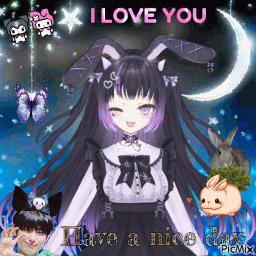 Lunalina, an anime girl with bunny ears, wishes 'I Love You' and 'Have a Nice Day' amidst a starry night with Sunoo.