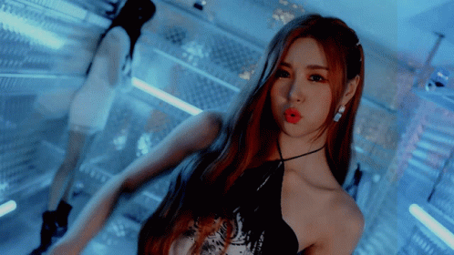 Lunarsolar's Taeryeong poses and performs in a music video, showcasing her red hair and black top.