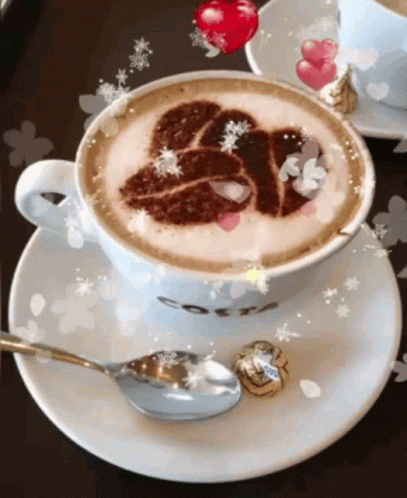 A beautifully crafted cup of coffee with latte art depicting coffee beans, surrounded by animated hearts and flowers.