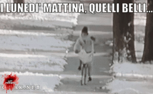 A person riding a bicycle falls in the snow on a Monday morning, accompanied by the sarcastic Italian caption.