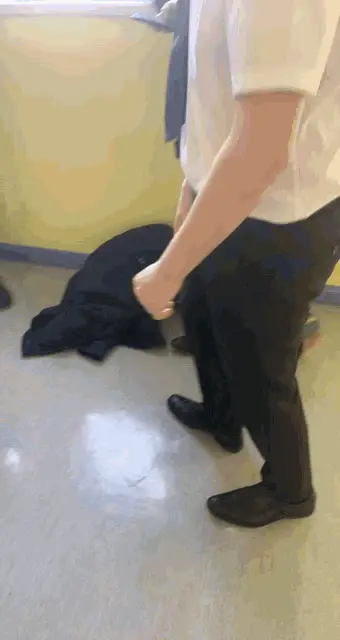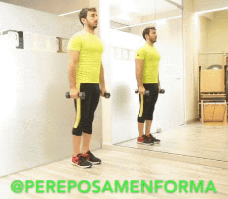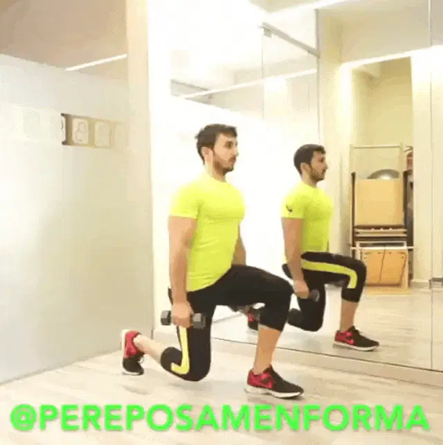 Pereposamenforma demonstrates dumbbell lunges, performing a workout in a gym with a mirror.