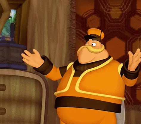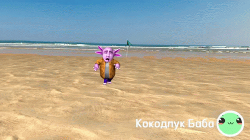 Luntik character, Kokodluk Baba, running on a sandy beach with waves in the background.