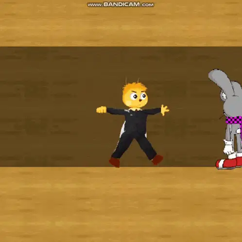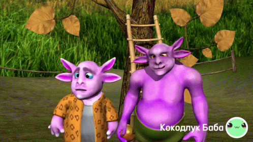 Two purple animated characters, resembling Luntik and Kokodluk Baba, stand in a grassy field with a tree and ladder.
