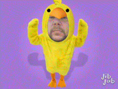 A man with a beard, identified as Lurken, dances in a yellow chicken costume against a purple background.