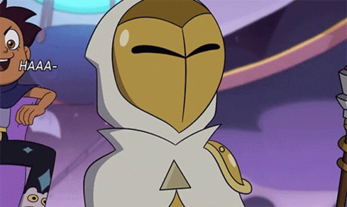 Luz surprises the Golden Guard, also known as Hunter, with a 'YAAH!' in a scene from The Owl House.