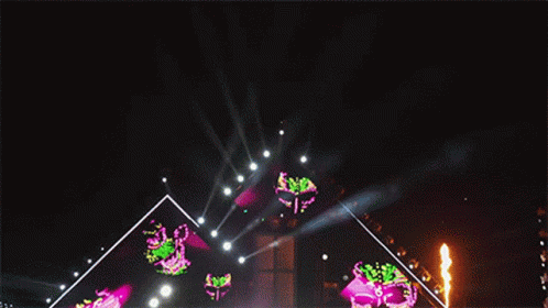 A vibrant stage light show with colorful masks and geometric patterns, creating an energetic atmosphere.