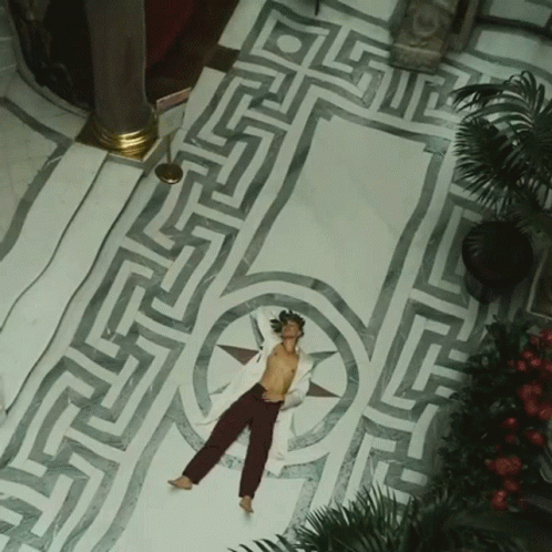 Damon Dominique lies shirtless on a marble floor with a geometric maze pattern, wearing a leafy crown.