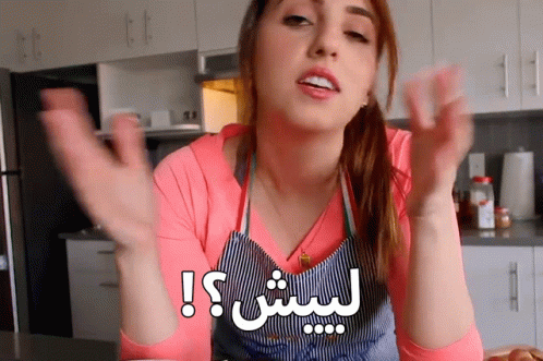 Asala Maleh shrugs and makes a questioning face in her kitchen, asking 'Why?!' with a humorous expression.