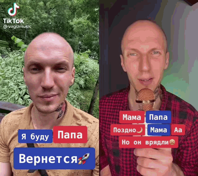 A bald man sings into a microphone, with Russian captions appearing on screen in a split-screen video.