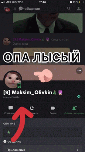 A Discord profile for Maksim_Olivkin featuring a cat avatar and a 'bald' meme overlay.