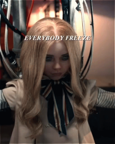 The M3gan doll appears with the text 'Everybody Freeze' in a workshop setting.
