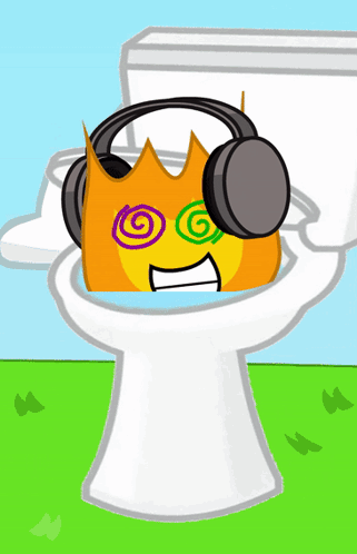 Firey, the character from Battle for Dream Island, wears headphones and sits on a Skibidi Toilet with swirling eyes.