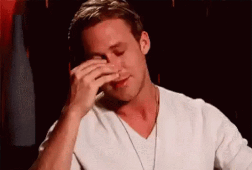 Ryan Gosling performs a classic facepalm, embodying the 'Ma Dai' meme of disbelief and exasperation.