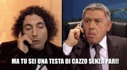 Boris Flavio and Boris Lopez on a split screen call, one exclaiming 'Ma tu sei una testa di cazzo senza pari!'