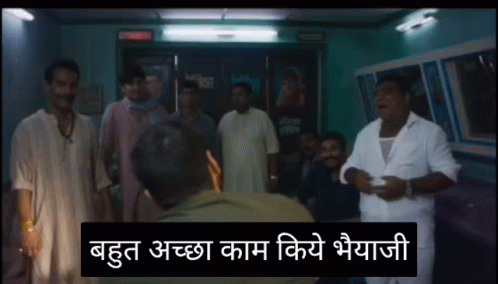 A group of men in a room, with a Hindi caption saying 'You did a very good job, brother,' from Mirzapur.