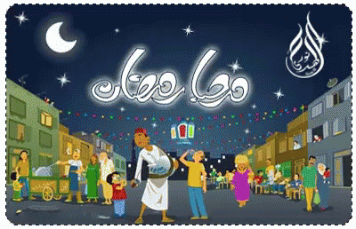 A festive cartoon celebrating Ramadan Kareem, featuring people walking with traditional fanoos lanterns under a crescent moon.