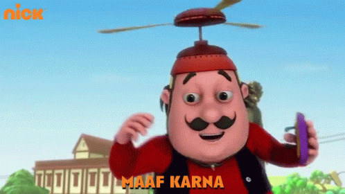 Motu from Motu Patlu apologizes with his flying helmet, saying 'Maaf Karna'.
