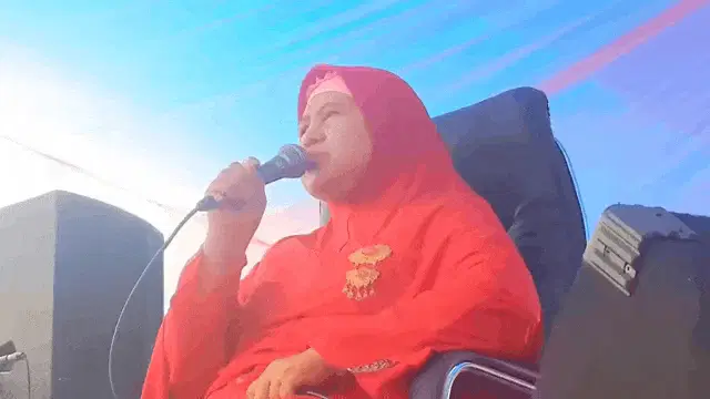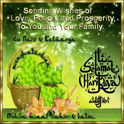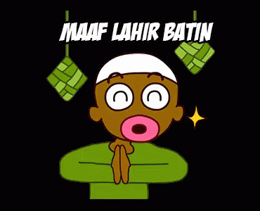 Animated character with ketupat wishing 'Maaf Lahir Batin' for Eid al-Fitr.
