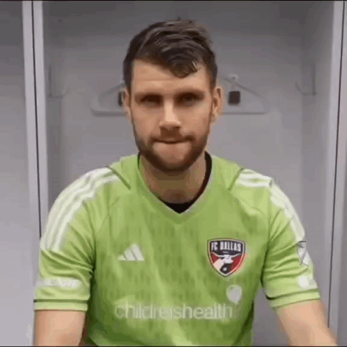 Maarten Paes, the FC Dallas and Indonesia goalkeeper, makes a funny face while wearing his green soccer jersey.