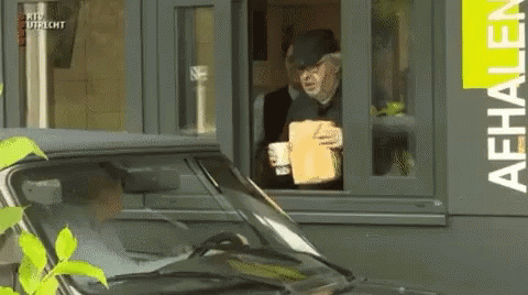 Maarten Van Rossem receives his order at a McDonald's drive-thru, collecting a bag and a drink from the window.