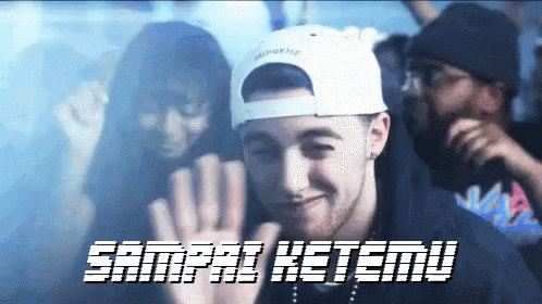 Mac Miller waves to the crowd with 'Sampai Ketemu' (See You) on screen, smiling in a white cap.