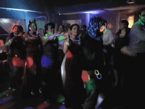 A lively group of people dancing the Macarena in a dark room, illuminated by vibrant neon glow accessories.
