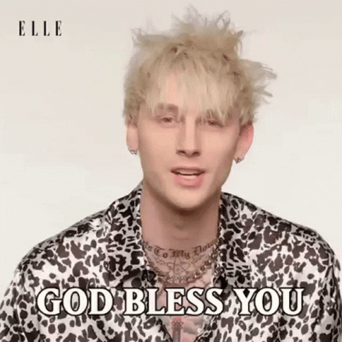 Machine Gun Kelly, also known as Mgk, with blonde hair and a leopard print shirt, says 'God Bless You'.