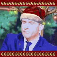 Emmanuel Macron dressed as a Christmas reindeer Santa, surrounded by euro symbols, in a festive meme.