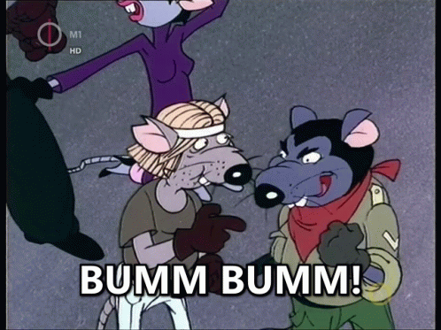 A scene from the Hungarian animated film Macskafogó (Cat City) with an explosion and 'BUMM BUMM' text.