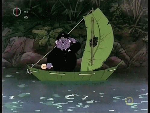 A cartoon character from Macskafogó (Cat City), possibly Tredbobek, navigates a boat down a waterfall.