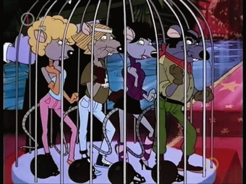 Four cartoon mice from Macskafogó (Cat City) dance inside a large birdcage, wearing various outfits.