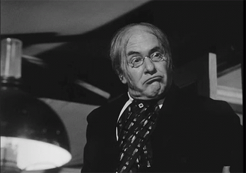 A man with glasses and a distinctive expression of frustration and indignation from a vintage black and white film.