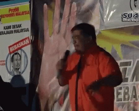 Mad Sabu speaks passionately into a microphone at a political rally in Malaysia, with banners calling for reform.