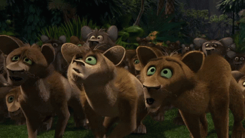 A group of Foosa from Madagascar look surprised, with one in the center asking 'Moi?' (Me?).