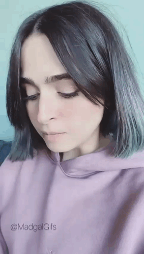 Madgal, a young woman with short dark hair, wearing a purple hoodie, looking down and then up.