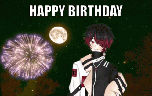 Madhouseeboy celebrates a happy birthday with fireworks and a full moon, featuring a VTuber character.