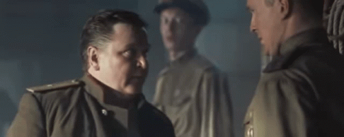 Madyanov, a Soviet Commissar, angrily threatens another man in uniform, pointing at his forehead.