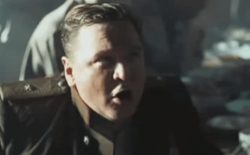 Actor Roman Madyanov portrays an angry commissar in a dramatic scene, likely from the Russian film 'Burnt by the Sun 2'.