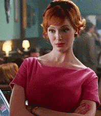 Joan Holloway from Mad Men, with her signature red hair, stands with arms crossed, giving a judging look.