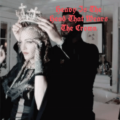 Madonna is crowned, wearing a veil and elaborate jewelry, with the text 'Heavy Is The Head That Wears The Crown' visible.