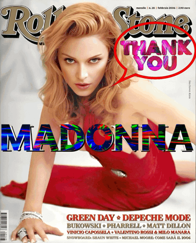 Madonna on the cover of Rolling Stone magazine, with a "THANK YOU" speech bubble and butterflies.