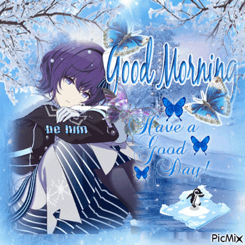 Mafuyu Asahina from Project Sekai in a winter-themed 'Good Morning, Have a Good Day!' image with butterflies and a penguin.