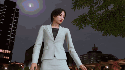 a woman in a white suit stands in front of a city skyline