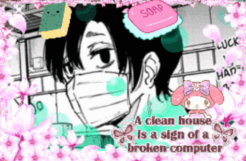 Mafuyu Seba from Sakamoto Days in a meme featuring the quote 'A clean house is a sign of a broken computer'.
