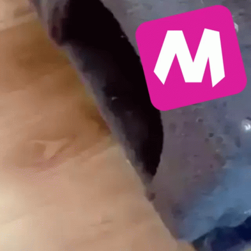 A cute tabby cat peeks out from a dark tunnel, looking up at the camera, with a magenta 'M' logo visible.
