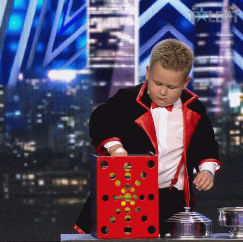 A young magician performs a captivating trick on Got Talent España, making a yellow scarf disappear and reappear from a red box.